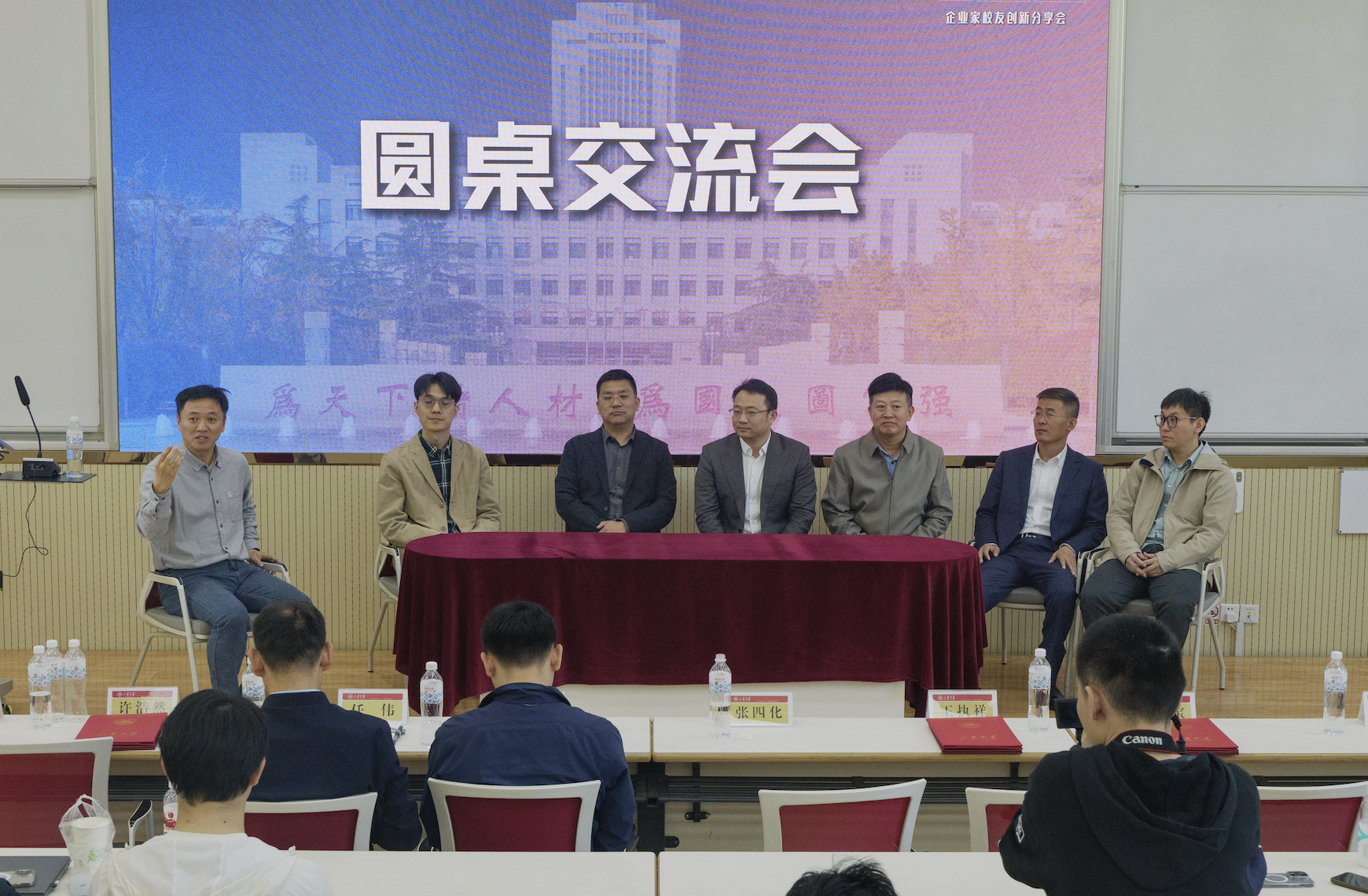 在圆桌交流环节中,张四化书记与六位员工共同围坐在讲台上,与现场员工围绕职业发展路径、创业心态准备、人工智能产业前景等问题进行了深度互动。员工们坦诚分享、悉心指导,为同学们未来的求职与创业提供了宝贵建议。