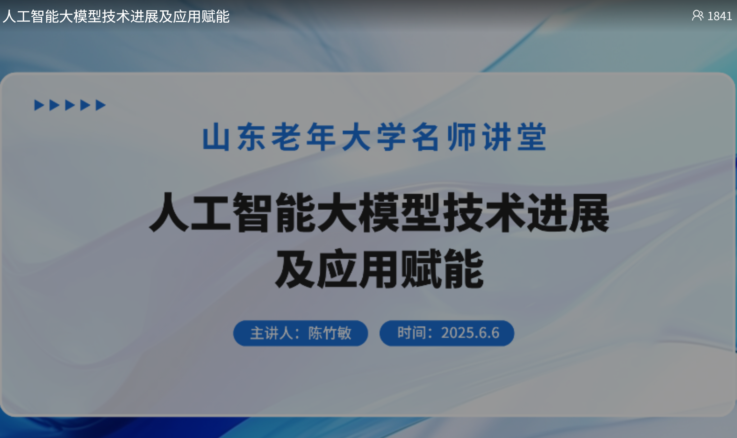 6月6日,陈竹敏教授做客山东老年大学名师讲堂讲授人工智能。陈竹敏教授讲解了人工智能基本原理与技术发展脉络,人工智能大模型、DeepSeek的技术实破与实践应用,人工智能在生活场景中的实践案例等。山东老年大学1800余名学员通过线上平台认真聆听了专题报告,学员们纷纷表示课程内容丰富、讲解生动,对课程给予了高度评价。报告内容使学员们深入了解了人工智能领域的最新发展,进一步坚定了大家对人工智能技术赋能社会发展,创造美好生活的信心与期待。