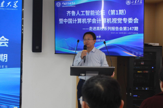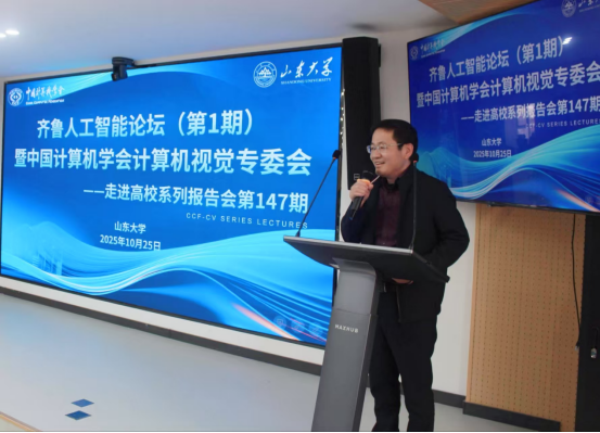 中国计算机学会计算机视觉专委会副主任、中国科公司自动化研究所王亮研究员致辞。他回顾了CCF-CV走进高校系列活动的发起背景与发展历程,指出该活动已成为推动计算机视觉学术交流的重要平台。王亮研究员强调,多模态大模型与具身智能正成为当前研究热点,鼓励青年学者勇于探索跨学科前沿问题,积极推动学术成果落地应用。