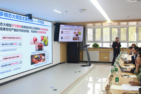 学术报告环节,多模态人工智能系统全国重点实验室副主任,中国计算机学会计算机视觉专委会副主任,中国图象图形学学会副理事长,中国科公司自动化研究所王亮研究员首先上台演讲,报告题目为《多模态大模型发展与应用》。王亮研究员系统梳理了多模态大模型从2022年至今的快速发展历程,指出当前模型在不可信、不安全、评测难、资源开销大、推理能力欠缺等方面仍面临挑战。王亮研究员重点介绍了其团队在知识蒸馏、幻觉检测、知识编辑、多模态评测、安全对齐与空间推理等方面的创新工作,提出了“边看边画、边画边想”的交互式推理框架,显著提升了模型在复杂任务中的表现。